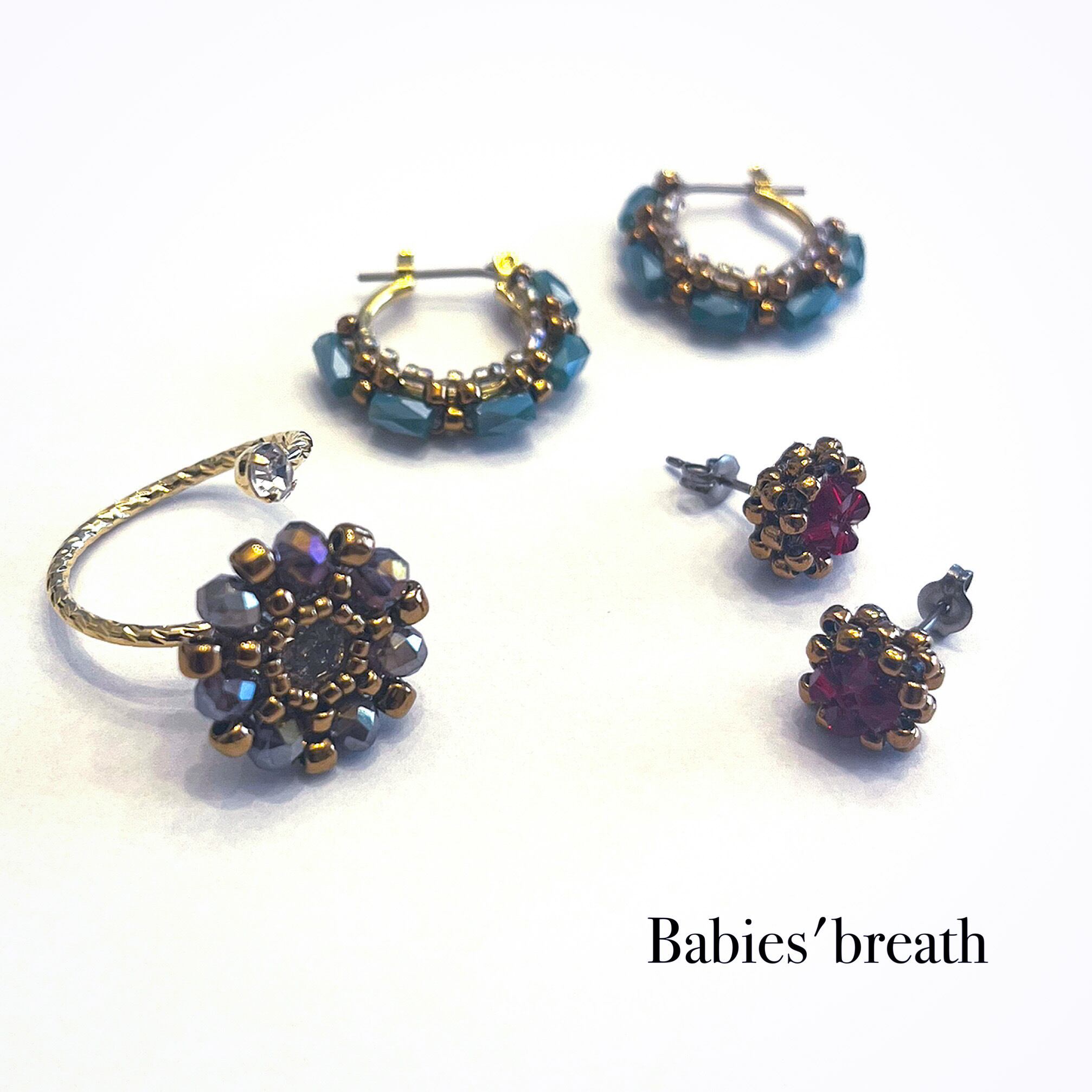 レクタングルビーズと小さなビーズをフープに沿わせて編んだピアスです。