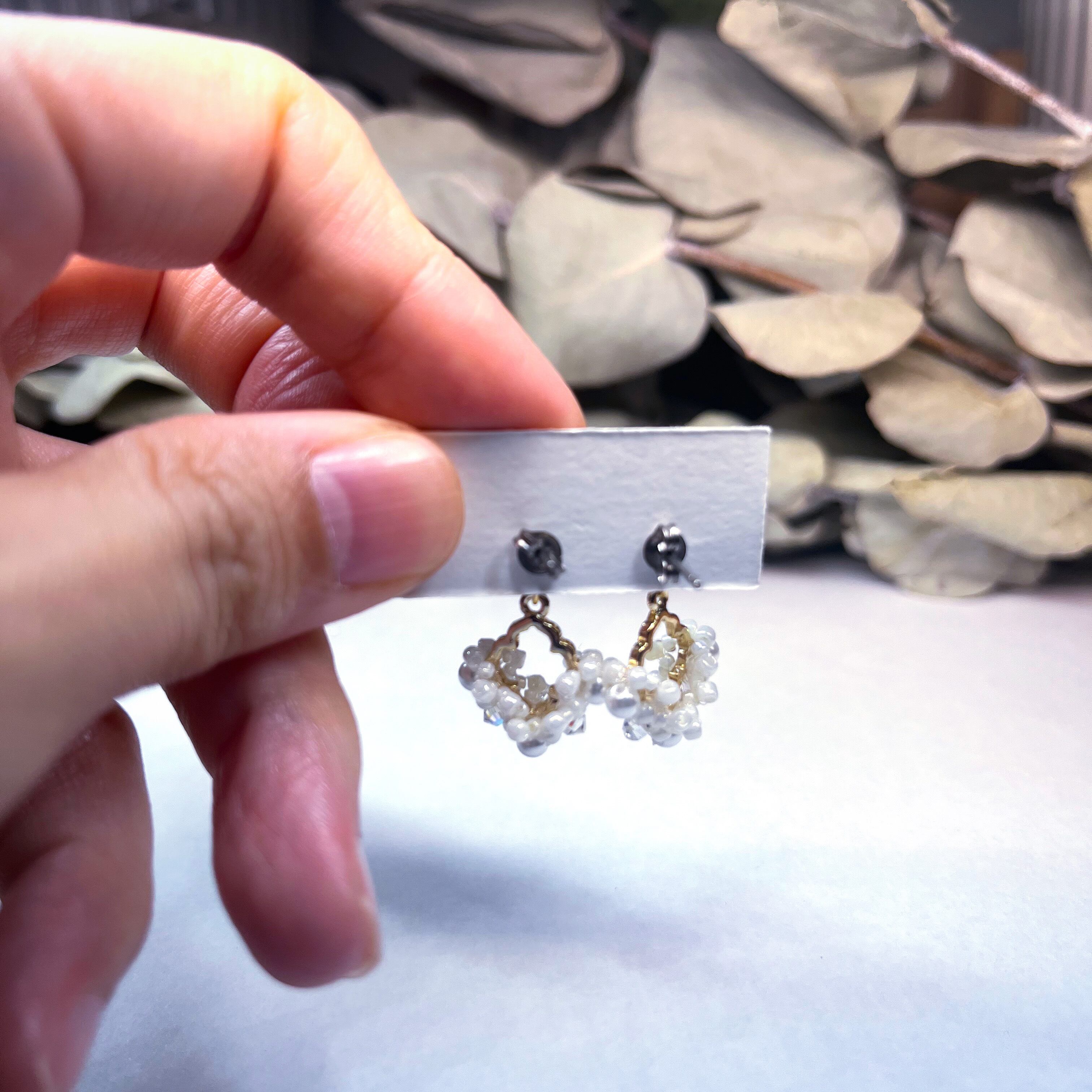 小さなビーズとクリスタル・パールを動きのある編み方でレースのように仕上げたパーツのピアス・イヤリングです