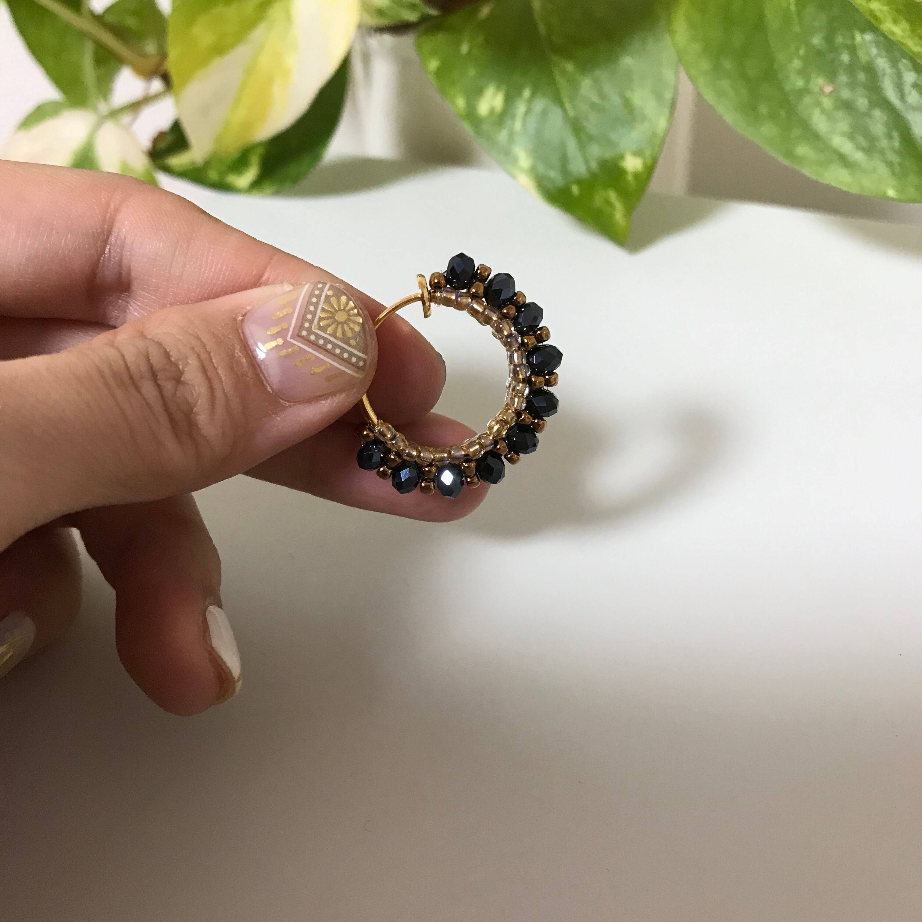 光沢のあるブラックのガラスカットビーズと小さなビーズをフープに沿わせて編んだイヤリングです。