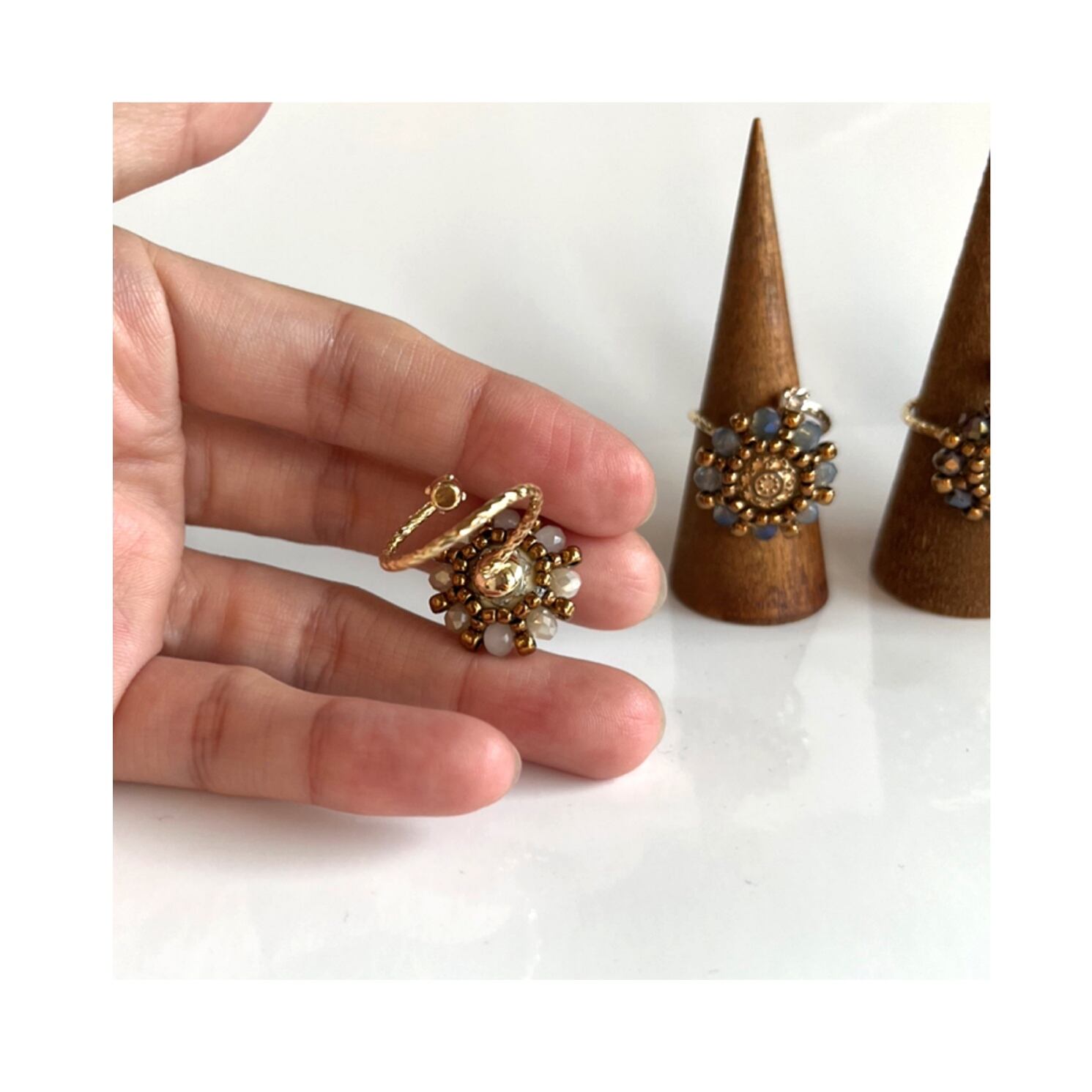 ころんとしたドイツ製ビーズを中心に編んだオリジナルのお花のリングです。